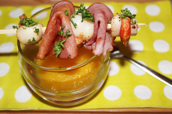 Cette deuxième recette, est un peu plus élaborée. Il s’agit d’une brochette de Noix de Saint Jacques et Bacon avec une compote de mangue. c’est vraiment délicieux mais certes un peu plus complexe à réaliser.