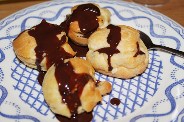 Pour le dessert, on termine sur une note chocolatée avec des profiteroles à la crème parfumée au rhum. J’en ai l’eau à la bouche.. Bon appétit !