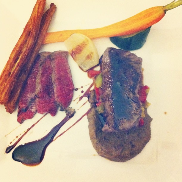 Mon avis : un sans faute pour la viande, délicieuse, et pour les accompagnements. Même si ça doit prendre beaucoup de temps à réaliser, j’ai adoré la présentation des churros à la pomme de terre. Sous le rumsteck, un caviar d’aubergines accompagné de petits légumes fondants cuits à l’huile d’olive.. Délicieux vous l’aurez compris !
