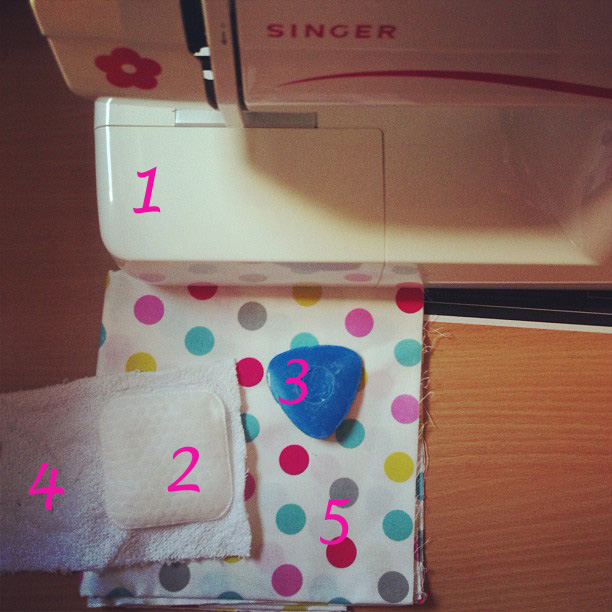 1 – une machine à coudre 2 – des cotons ou tout autre support qui vous servira de modèles pour réaliser vos lingettes (verre, bocal…) 3 – une craie spéciale tissu 4 – tissu éponge ou bambou 5 – (optionnel : soit vous faites 2 faces en éponges soit une face tissu/une face éponge)