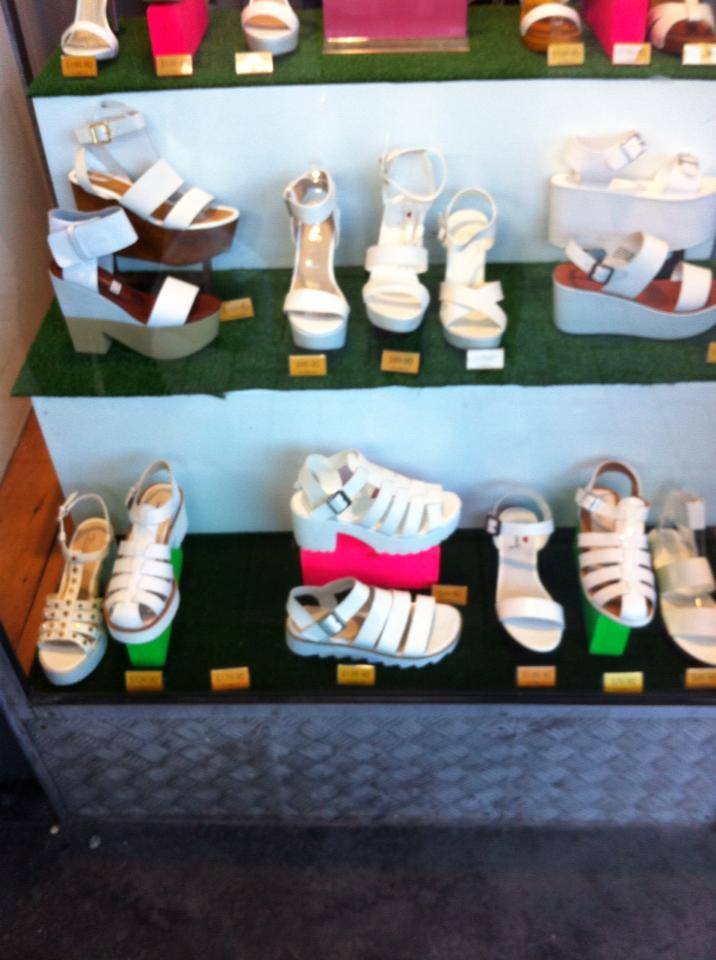 Malgré la pluie et le vent, ici l’été approche à grand pas. Contrairement à moi qui suis emmitouflée dans un polaire avec un jean et des baskets (oui je suis hyper sexy en ce moment), ici les femmes sont plus en jupe, robe, et petites sandales. En Numéro 3 de ce pays de la shoes originale, j’ai nommé les sandales à plateformes blanches. La semaine dernière, lors d’une soirée au restaurant, j’ai été impressionnée par ces chaussures. Elles avaient toutes les mêmes (le modèles au milieu en bas sur le cube rose fluo). Il me semble avoir vu des modèles similaires sur des blogueuses françaises l’été dernier. Mon avis, je déteste déjà les chaussures blanches à la base (à part les baskets) mais montées sur une plateforme c’est encore pire.