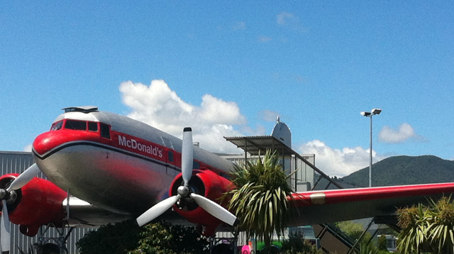 Je reviens aujourd’hui pour vous présenter la suite de mes vacances à Napier. Après vous avoir montré >> ICI << le début du séjour, en route direction Taupo. Taupo est situé en plein centre de l’ile du nord, la région du lac de Taupo est l’un des passages obligés lors de votre venue en Nouvelle-Zélande. Pourquoi ? Les lacs, les montagnes, et l’offre d’activités et d’aventures en font sa renommée. Le lac est magnifique et les activités nautiques sont variées. Pour notre part, nous avons préférés la randonnée plutôt que de payer $150 pour un tour de 30 minutes en jets-boats. Certes les sensations ne sont pas les mêmes, mais le spectacle est tout aussi beau. Pour notre part, nous avons simplement déjeuné face au lac après avoir immortalisé l’avion dans lequel vous pouvez manger chez McDonald’s. Pas de burger lors du déjeuner, mais un bon petit repas pour prendre des forces avant la randonnée qui nous attendait.