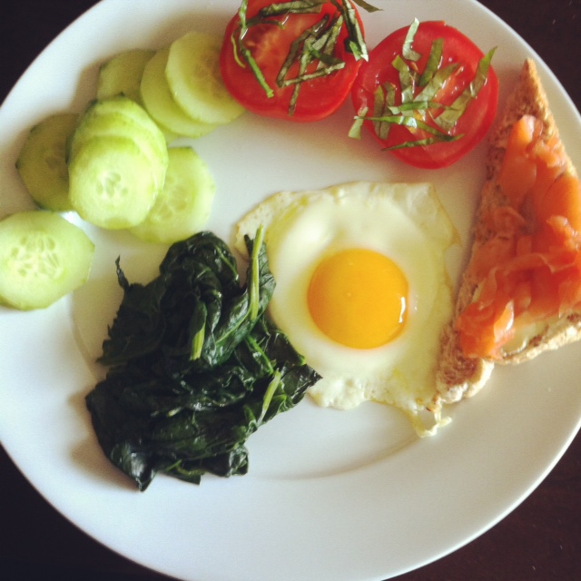 Je sais que certains parmi vous pensent que je passe ma vie au resto, mais an fait pas du tout. Certes manger reste une des choses que j’aime le plus faire alors forcément ça passe par prendre des photos de ce que je mange. Sur la photo ci dessous, voici le brunch de lundi dernier. Quelques rondelles de concombre, une tomate avec une filet d’huile d’olive à l’ail et au romarin avec du basilic frais, un oeuf sur le plat, des épinards et une tartine de fromage frais et saumon. Ça vous arrive de faire des brunchs ? Que mangez-vous ?