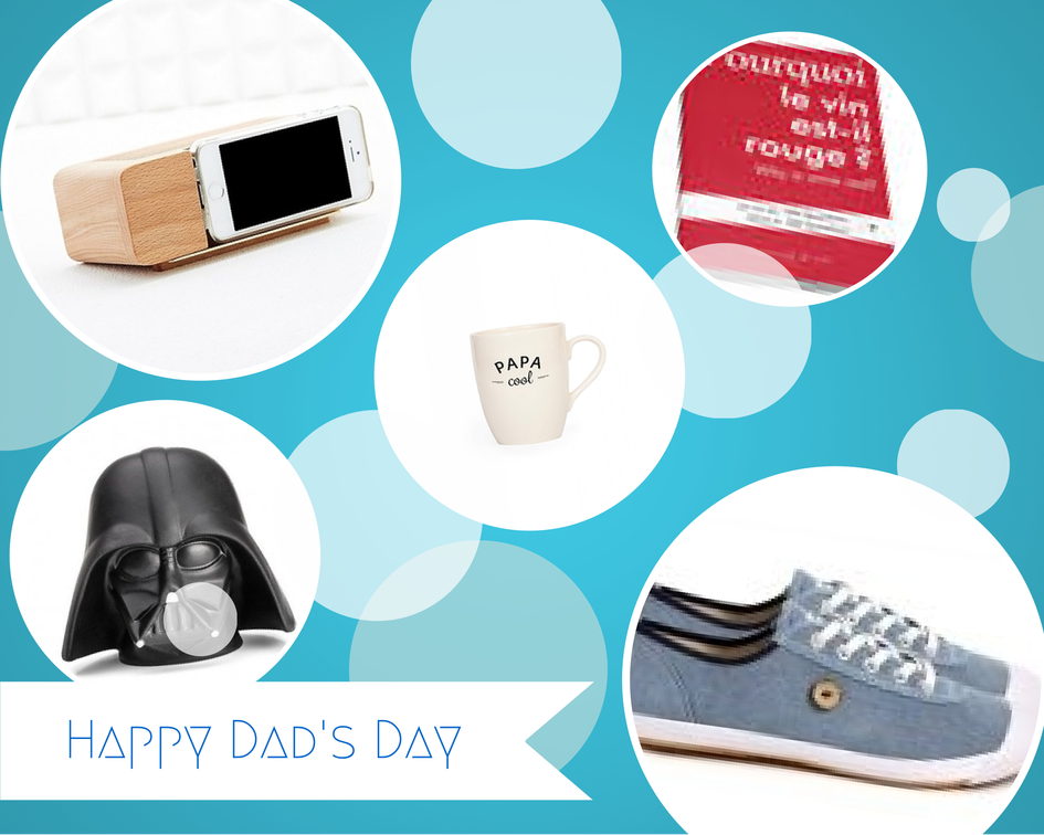 1/ Un joli mug Papa poule ou papa cool en édition limitée chez emoi emoi 2/ Une paire de baskets Faguo en toile de coton bleu 3/ Un dock réveil matin simple, élégant et raffiné en bois de hêtre Urban Outfitters 4/ Pour être incollable sur le vin, « Pourquoi le vin est-il rouge? » livre en vente pour Made in Design 5/ Pour les fans de Star Wars un peu stressés, voici Dark Vador anti stress chez Super Insolite