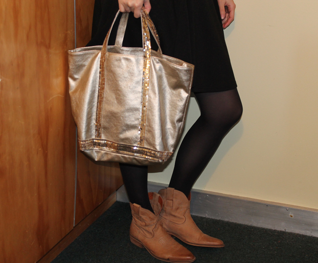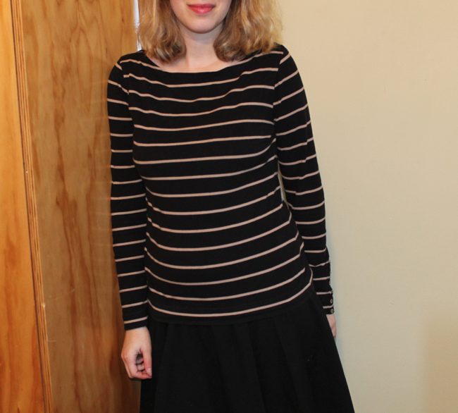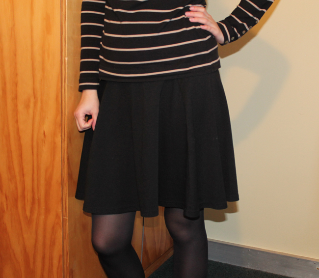 Jupe Cotton On – Marinière H&M – Collants Dim – Boots Koah – Sac Vanessa Bruno en édition limitée chez Monnier Frères – RAL Revlon