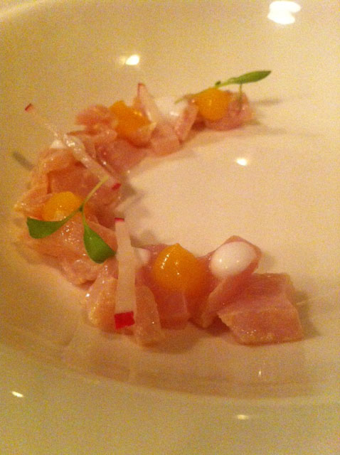 Ceviche of the day, lime coriander, chili, mandarin, coconut, pickled radish, c’était frais et délicieux. Il n’y avait pas trop de noix de coco et tant mieux car je n’aime pas vraiment ça. L’assiette est très jolie présentée et les suivantes le sont tout autant.