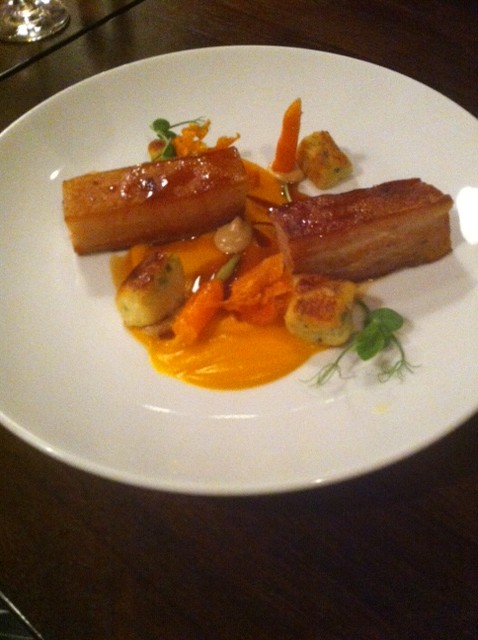 Slow cooked free range pork belly, herb gnocchi, carrot garden, shallot & garlic reduction, 4ème plat de ce dîner je commence à saturer. Mais je mange tout car c’est tellement bon. Rien que d’en parler, ça me donne envie, pas vous ? Habituellement, je ne suis pas fan des gnocchis, mais ceux-là sont fondant en bouche. Comme les plats précédents, vous pouvez remarque que l’assiette est joliment dressée.