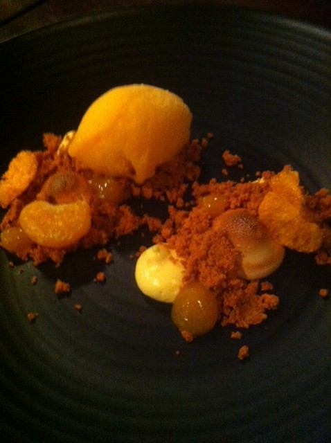 Textures of mandarin, mandarin sorbet, caramel meringue, orange curd, passion fruit, 5ème et dernier plat. Vous savez ô combien je suis gourmande ? Mais c’est certainement ma seule déception pendant ce repas. J’aime les mandarines, mais je n’ai pas aimé ce dessert. C’était trop acide pour moi, pourtant le jeu de textures était intéressant. Après c’est un avis tout à fait personnel sur ce plat là.