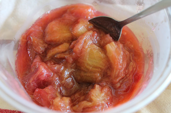 Pour la recette, j’ai préparé un sirop avec 3 cuillères à soupe de sucre et 50cl d’eau. J’ai attendu que le tout frémisse pour y déposer mes morceaux de rhubarbe préalablement coupés (un centimètre environ). Comptez 2/3 minutes de cuissons pas plus, sinon vous aurez vraiment une compote.