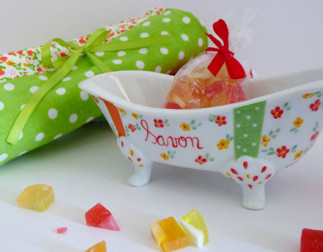 Nous travaillons donc le coton, l’éponge et je peins sur de la porcelaine de Limoges essentiellement car nous privilégions les belles matières pour être sûr de la qualité de nos produits.