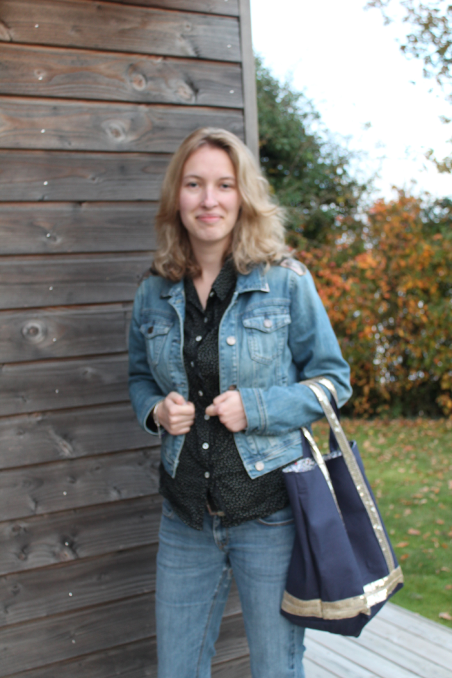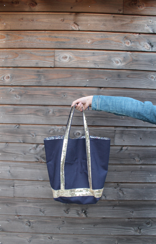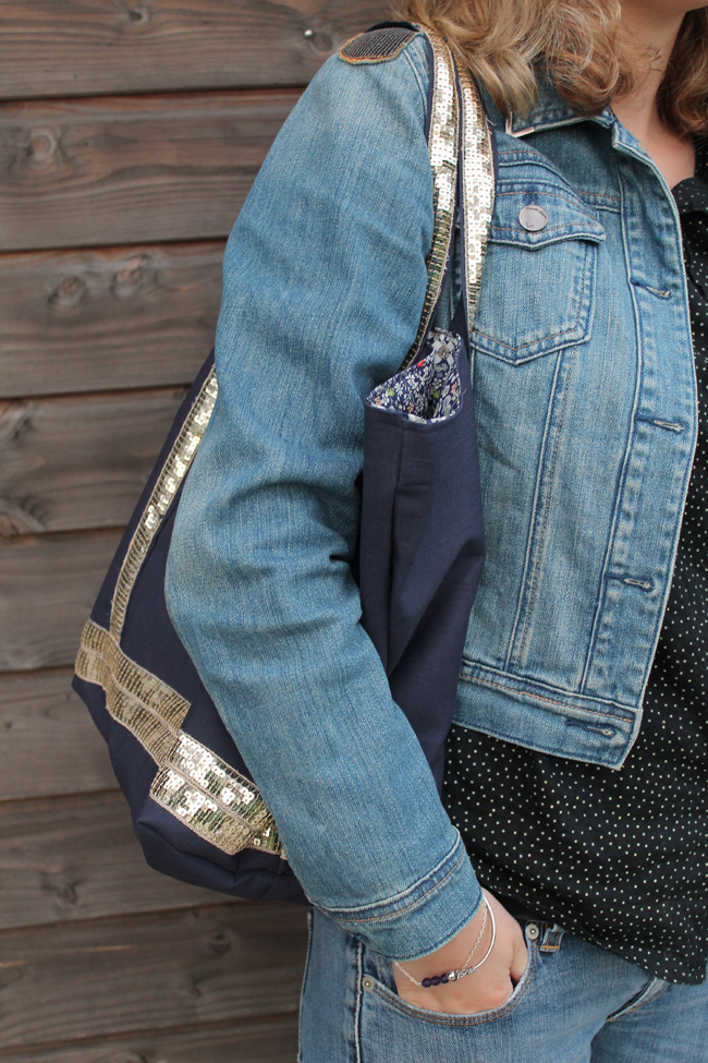 Si vous me suivez sur les réseaux sociaux, vous n’êtes pas sans savoir que je me suis remise à la couture. Largement influencée par Aurore et ses jolies créations, j’ai pris mon courage à deux mains et je me suis lancée dans la confection d’un sac. J’avais acheté le tissus et les paillettes, il y a deux ans déjà, mais n’avais jamais trouvé le temps de me lancer. Après quelques déboires avec les paillettes, je trouve que ce sac fait son petit effet. Il est doublé en Liberty et l’extérieur est en lin bleu marine et thermocollé pour plus de rigidité.
