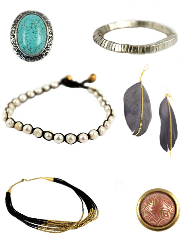 Bague ethnique Sioux 39€ Bracelet Makonde 29€ Bracelet de cheville en perles 35€ Boucles d’oreilles Plumes 35€ Collier ethnique du Nil 69€ Bague Goa 39€