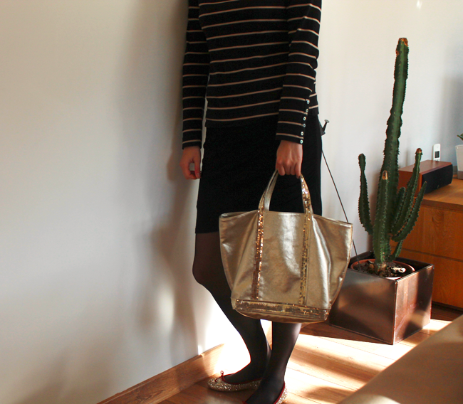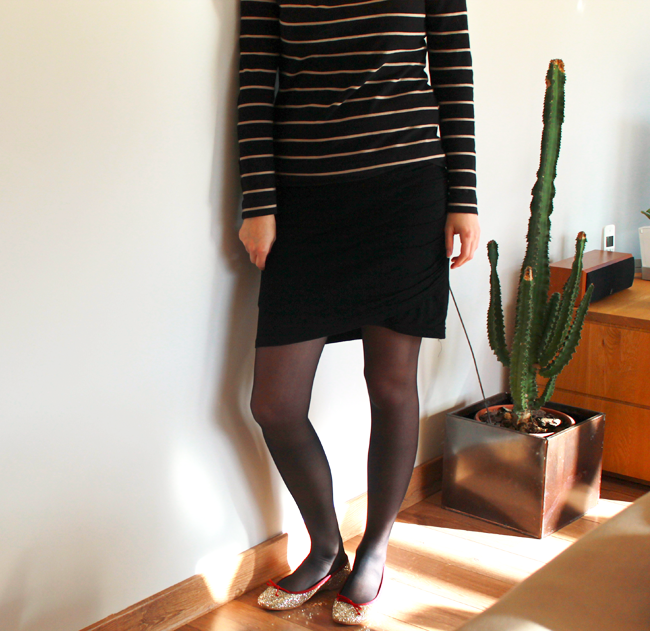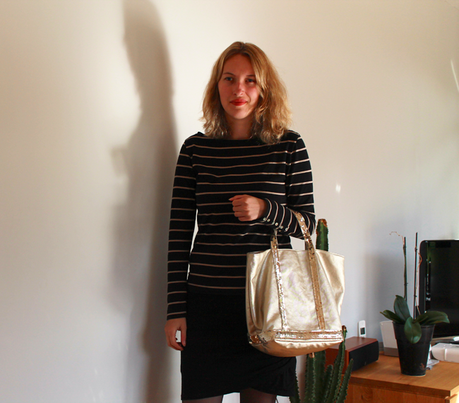 C’est le cas de ce look, vous aviez déjà vu cette marinière ici, ainsi que mon cabas à paillettes et puisque j’adore ça, j’ai complété ma tenue avec mes nouvelles ballerines de la marque Bobbies ainsi qu’une jupe drapée. C’est d’ailleurs de celle-ci dont je voulais vous parler. Je l’ai trouvé chez Cotton On à Wellington, un magasin avec de bons basiques de bonne qualité et à des prix pas excessifs. Bref, je l’ai vu, regardé plusieurs fois, mais jamais essayée. Puis un jour, alors que Jo m’embêtait parce que je ne portais pas de jupe courte, j’ai sauté le pas, enfilé la bête et me suis regardée sous toutes les coutures dans la cabine d’essayage avant de l’embarquer en caisse. En arrivant à la maison toute fière je me suis empressée de l’essayer et de la montrer. Verdict sans appel : « t’es canon » ! En gros, je me suis encore regardée sous toutes les coutures dans la salle et bain et contre toutes attentes, c’est certainement une des rares fois où je me suis trouvée moi-même très jolie. Je vous explique, je suis ce genre de fille qui ne se trouve jamais bien comme elle est. Mais pour une fois, j’étais fière et heureuse de porter une jupe courte et moulante sans ressembler à un boudin.