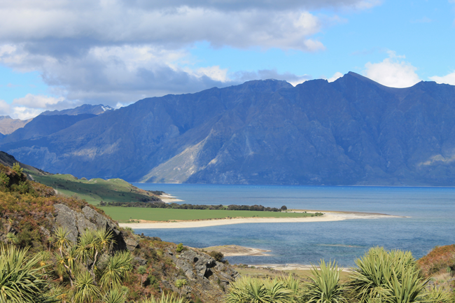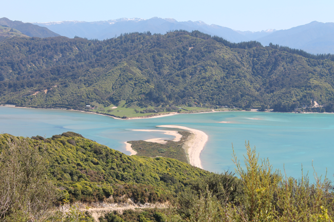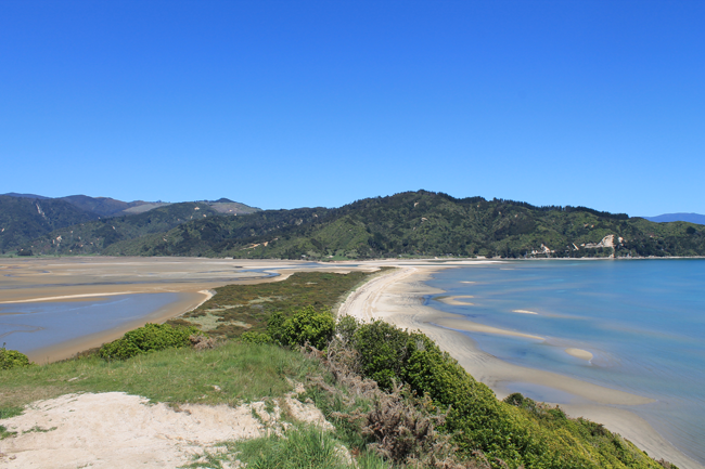Avant d’attaquer la quatrième journée, rappelez-vous,  on s’était rendu du côté de Farewell Spit pour une mise en bouche. Et après réflexion Jo avait bien fait de faire ce choix, parce que le lendemain, ce n’est pas moins de 12 km qui nous attendaient. N’étant pas vraiment sportive, j’appréhendais beaucoup, mais finalement le chemin d’accès était vraiment praticable et même si ça monte beaucoup (montagne oblige), c’était tout à fait faisable. Cette journée là, il faisait chaud, très chaud et j’ai bien cru que je n’arriverai pas jusqu’en haut. Je me suis d’ailleurs transformée en enfant de 3 ans « Dit Jo, quand est ce qu’on arrive ? », ou bien « Jo tu m’as dit qu’on était bientôt arrivé tout à l’heure alors qu’on continue de grimper », « Jo quand est ce qu’on mange » etc. Le pauvre, il m’a supporté et trainé jusqu’au bout. Mais finalement lui aussi il a un peu galéré lors de cette rando (il me l’a avoué bien après fierté oblige). Bref, si je l’ai fait tout le monde peut le faire. :) Et sincèrement quand on voit la beauté des paysages, tu n’as envie que d’une chose, voir la suite. Si on avait eu plus de temps on aurait peut être emprunté un chemin plus long mais ce qu’on a pu voir était déjà très beau. Jugez par vous même.