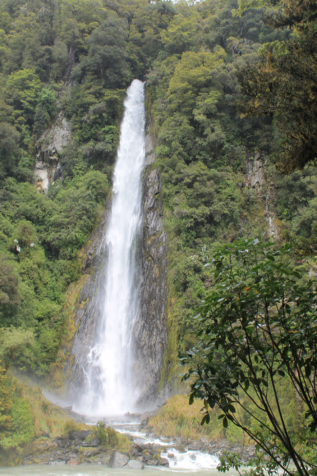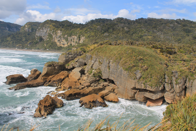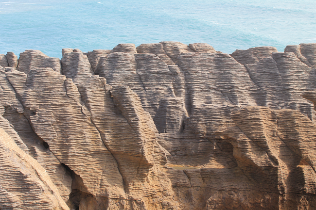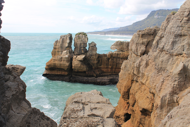 Jour 5 : Après un super repas chez KFC, une nuit au Fernwood Camping de Motueka et 20 piqures de Sandfly plus tard (un genre de moustiques), nous avons repris la route en direction de Punakaiki pour découvrir les « Pancake Rocks ». Punakaiki est un village de la région de West Coast sur la côte de la mer de Tasman. Les « Pancake Rocks » sont une importante attraction touristique de la région. Située à « Dolomite Point », un peu au sud du village, c’est une région calcaire très érodé où la mer entre pendant la marée haute par des geysers maritimes verticaux. On peut découvrir les Pancake Rocks en empruntant des chemins dont certains sont taillés dans la roche. C’est assez impressionnant comme endroit, la roche ressemble réellement à des pancakes empilés les uns sur les autres. La roche est parfois grise, blanche ou ocre, et la mer de Tasman turquoise qui vient se jeter contre ses roches, c’est juste Amazing !