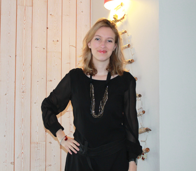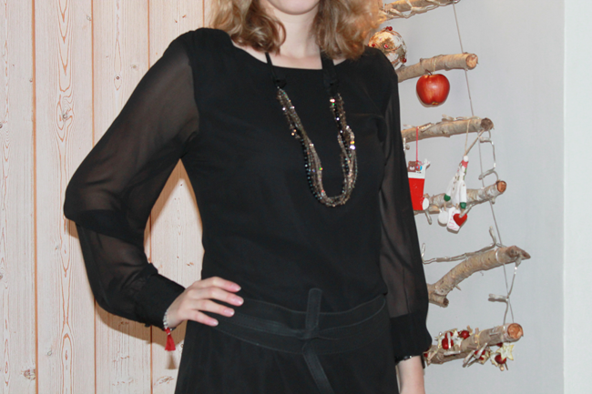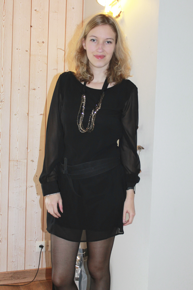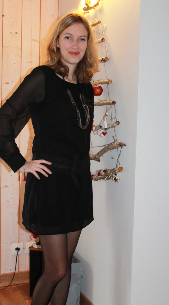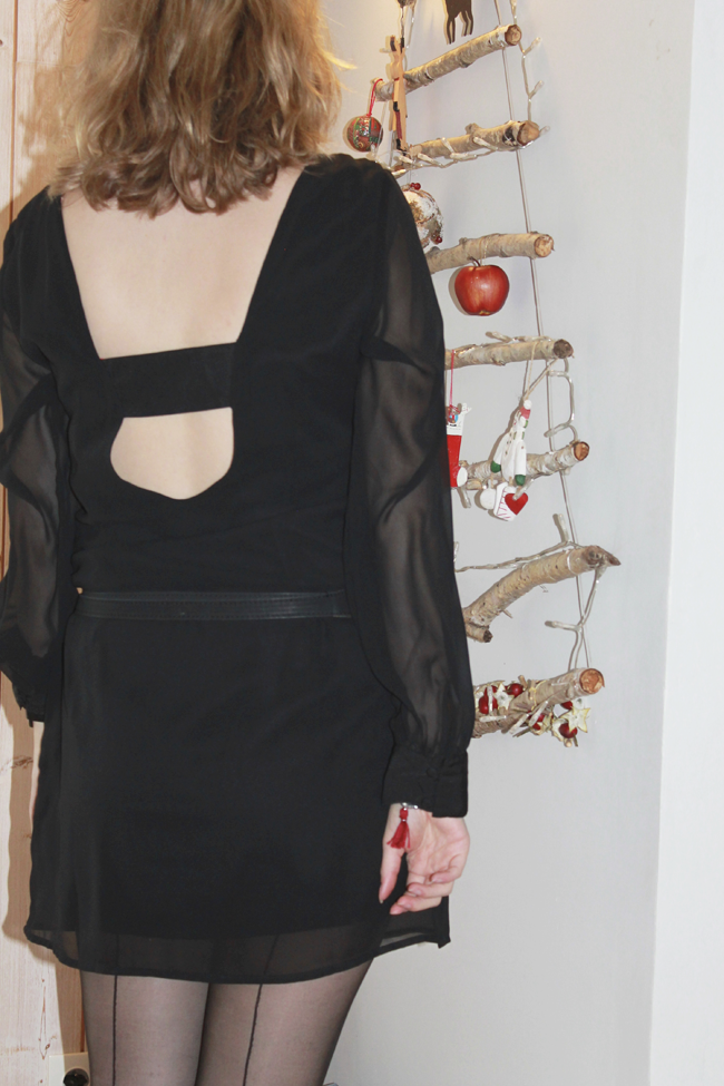 Je ne sais pas encore ce que je fais pour le réveillon du 31, mais une chose est sûre, c’est que j’ai l’embarras du choix côté tenue. Ce quatrième et dernier look est en quelque sorte un mix de pièces déjà vues sur le blog. Une robe noire Vero Moda avec un dos presque nu ceinturée et associée à mes collants coutures, des escarpins pour allonger la silhouette. Pour ajouter un peu de classe à l’ensemble j’ai misé sur un collier en perles de la marque 1.2.3. ainsi qu’un bracelet bientôt disponible sur mon eshop.