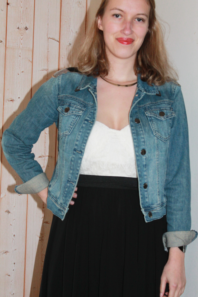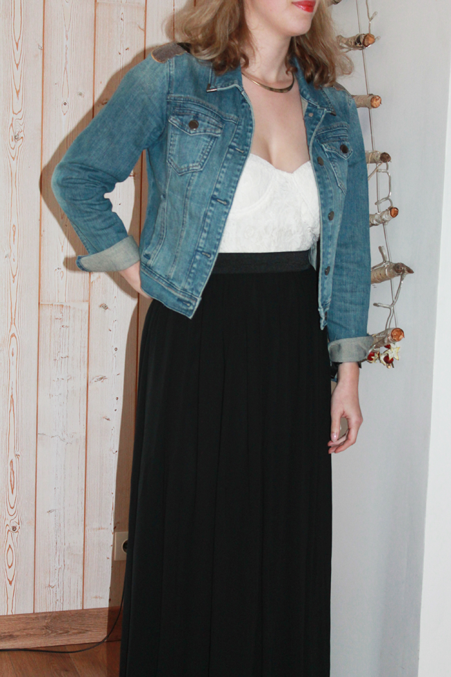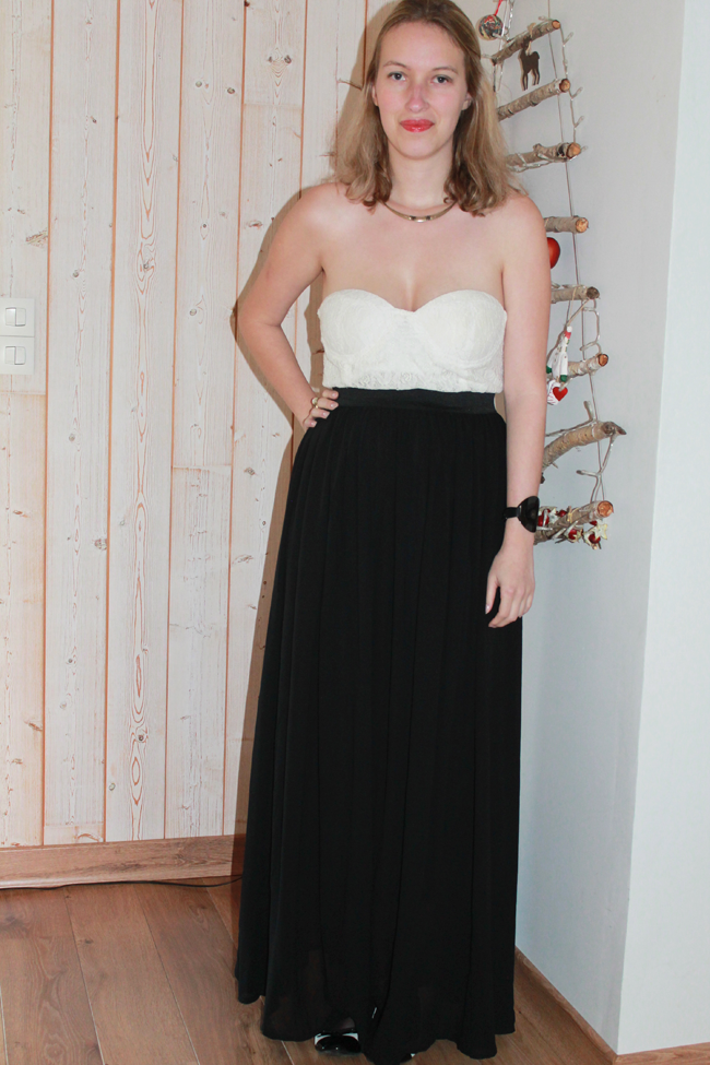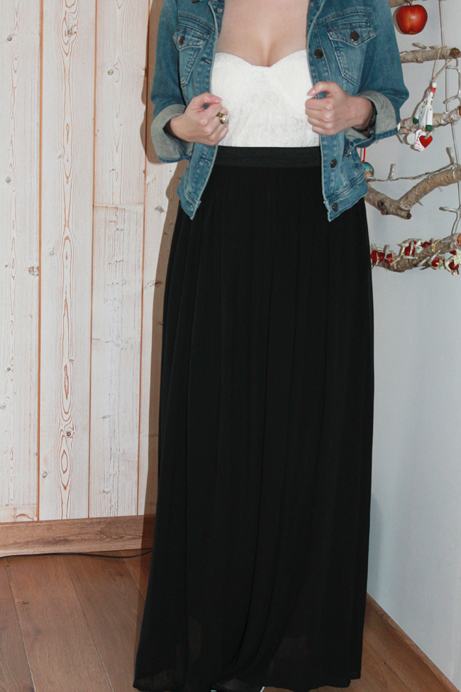 Pour continuer dans la série mode et look pour être chic pendant les fêtes, je vous présente aujourd’hui cette deuxième tenue. C’est celle que je portais l’année dernière pour mon réveillon à Wellington. Exit les ballerines, j’avais chaussé des sandales compensées. Cette année, je suis que le thermomètre ne dépassera pas les 15° (même s’il fait plus chaud que la moyenne), alors j’ai ajusté cette tenue. J’aime beaucoup les robes dos nu, mais j’avais envie de changer et d’essayer une robe longue. Celle-ci m’a été offerte par le site Des robes 2 filles, j’aime beaucoup la dentelle du bustier et le double voile de la jupe. Pour sortir, je l’ai accompagné d’une veste en jean Bonobo Jeans pour casser l’esprit trop chic de la robe. Mais je la verrai bien portée avec un perfecto en cuir noir.