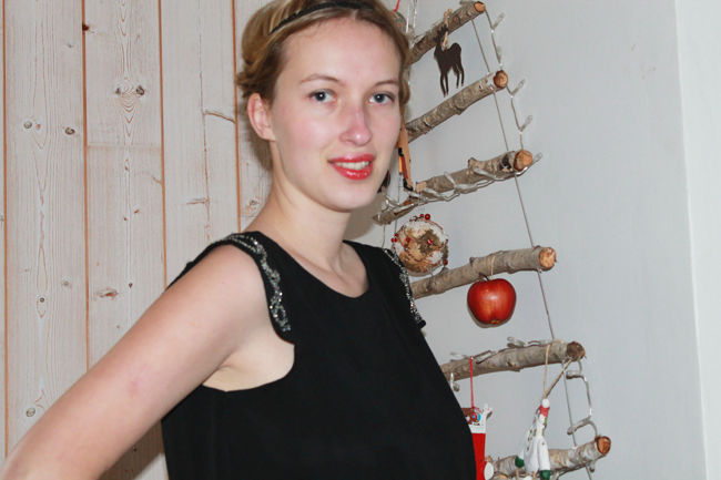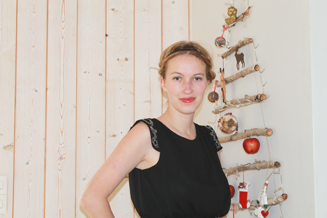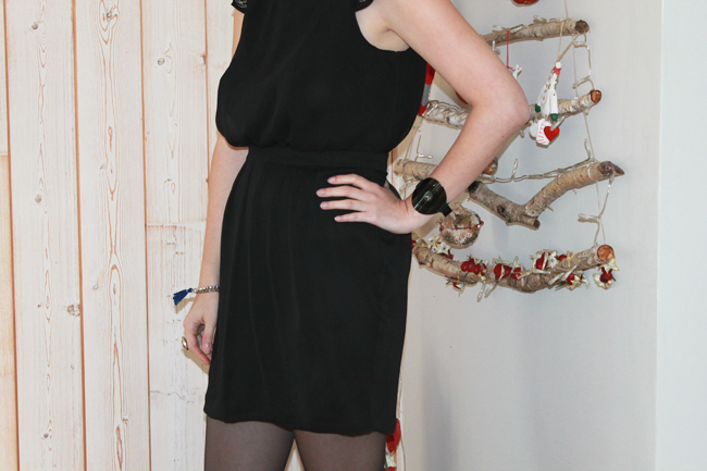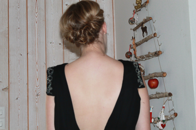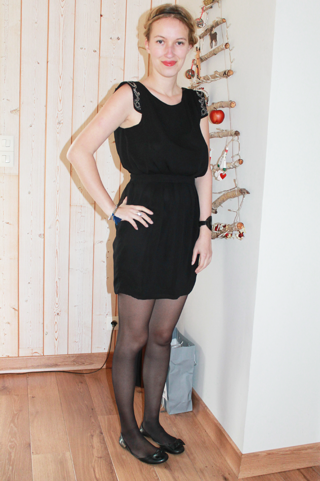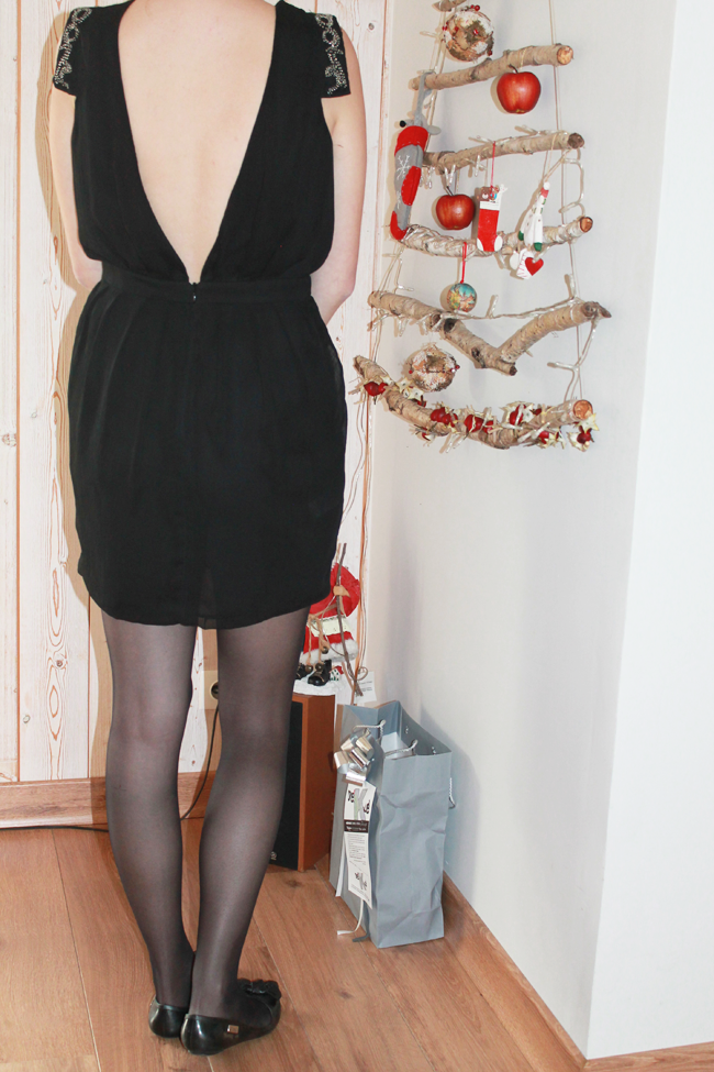 Après mon DIY pour réaliser un joli sapin de Noël, je commence ma série de photos de looks spécialement créés pour les fêtes. Je tenais à vous parler de cette robe dos nu Mango achetée il y a au moins 5 ans sur Ventes Privées. J’avais eu un vrai coup de coeur pour son dos nu. Je trouve que les robes dos nu ont un charme fou (à condition de bien savoir les porter). Seul hic, la robe est restée dans ma penderie très longtemps, parce que je ne suis pas toute fine (comprenez je ne pouvais pas rentrer dedans ;) ). Mais je n’ai jamais voulu la vendre, parce que j’ai toujours cru qu’un beau jour je finirai par rentrer dedans. Je peux enfin la porter sans pour autant ressembler à une dinde. Vous comprenez donc ma satisfaction de vous présenter cette robe aujourd’hui. Pour le reste de la tenue, j’ai fait dans la sobriété : une paire de ballerines, des collants noir, des bracelets By Clo et un peu de maquillage. Lorsque l’on porte une jolie robe dos nu, la question du maintien est importante. Ici, je ne porte pas de soutien gorge mais des coques qui se collent directement sur la poitrine. Ce n’est pas glamour j’en conviens mais c’est la seule alternative que j’ai trouvée pour ne pas avoir de soutien-gorge apparent.