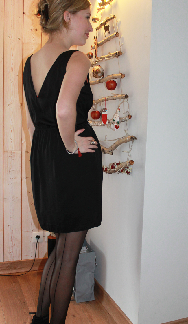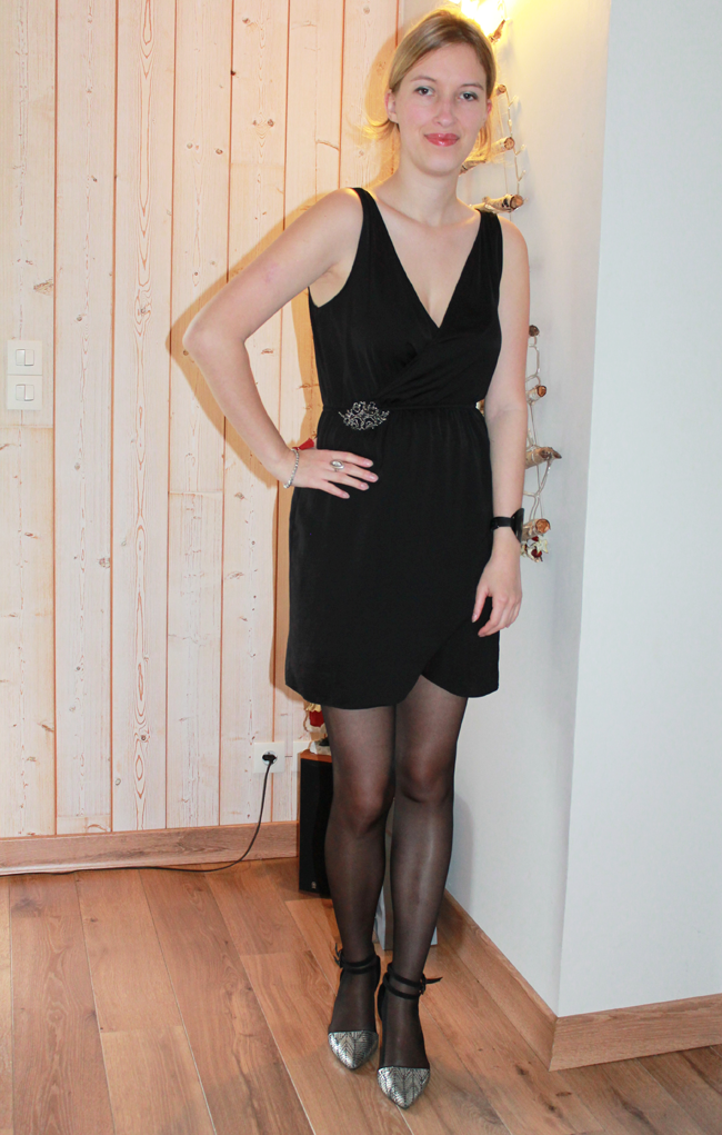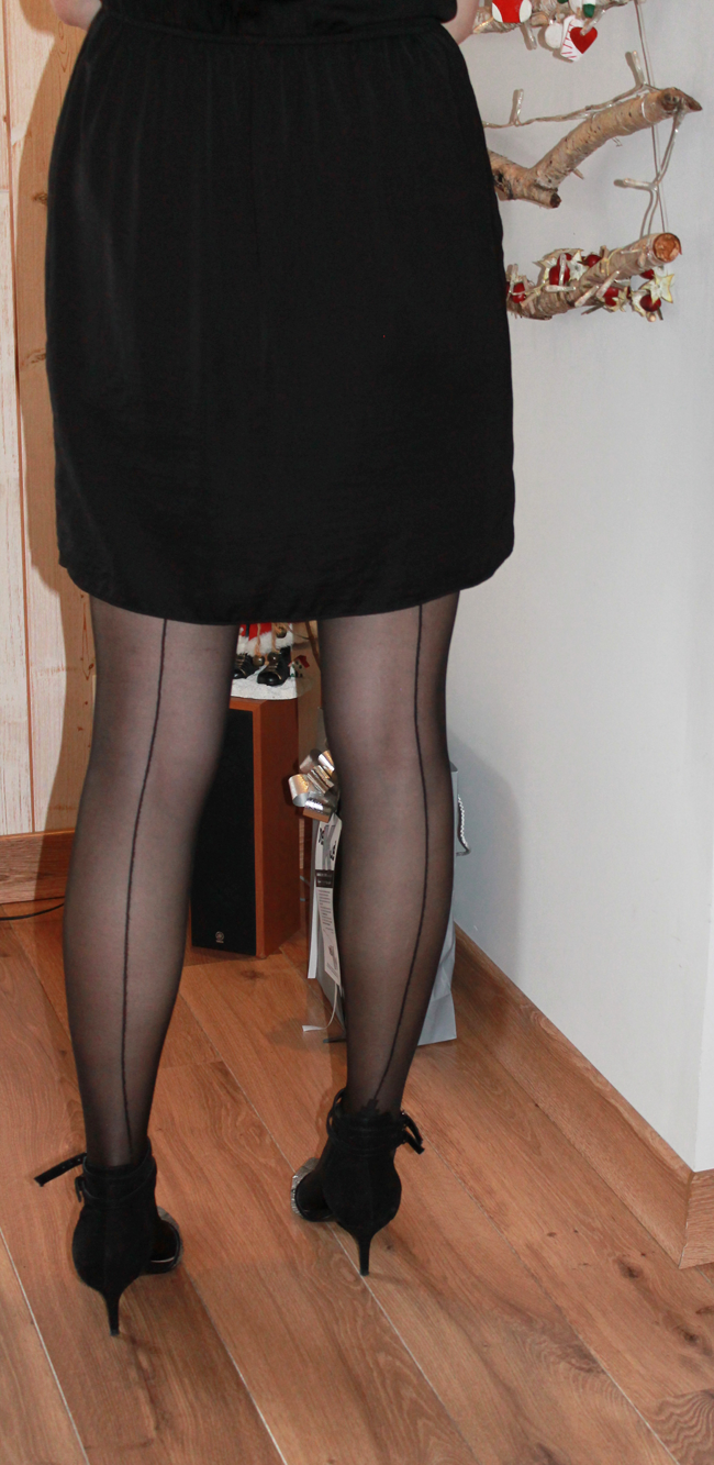 Après une robe dos nu, une robe bustier, voici un troisième look de fêtes avec une robe décolleté devant et dos et des collants über sexy ! J’ai toujours trouvé que les collants coutures ajoutent une pointe de classe à une tenue. Je trouve que les associer à une robe noire toute simple mais avec de jolis décolletés dos et devant permet une association chic et classe. J’ai rehaussé le tout avec une paire d’escarpins pointus et argentés pile dans la tendance ! Comme pour les deux premières tenues, j’ai seulement mixé des pièces plus ou moins anciennes de mon dressing. Demain, je vous présenterai une quatrième robe noire mais cette fois-ci parfaite pour les « frileuses ». En attendant, j’attends vos commentaires sur cette nouvelle tenue. Je trouve que ça fonctionne plutôt bien, qu’en pensez-vous ?