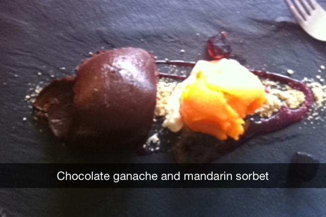 Quand au dessert, j’ai craqué pour ganache au chocolat accompagnée d’un sorbet mandarine. J’adore le chocolat, beaucoup moins la mandarine mais l’association des deux était parfaite. Et même si je suis hyper gourmande, je n’ai même pas réussi à terminer mon assiette !