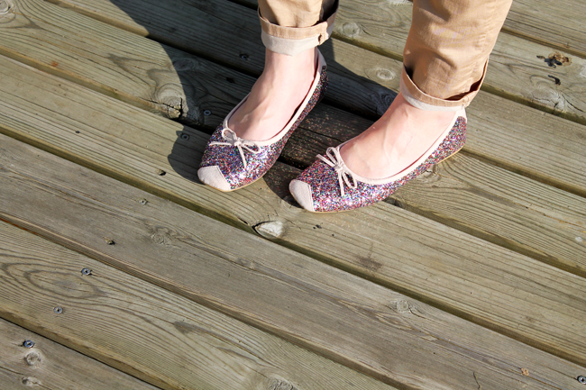Heureusement mercredi dernier, il a une nouvelle fois fait très beau et j’ai eu le temps de vous shooter 2 nouveaux looks dont celui-ci. J’avais très envie de vous montrer ma nouvelle acquisition : ma nouvelle paire de ballerines à paillettes achetées chez Cache Cache. J’ai donc créé un look autour de cette paire de chaussures. Pour rappeler le rose, j’ai choisi un top en transparence acheté chez Zara il y a quelques années déjà, et mon chino Levis. Je me suis malheureusement trompée dans la longueur (j’ai pris 30 au lieu de 32) voilà pourquoi je le retourne pour le porter. De même, vous noterez pas de soutien-gorge apparent comme avec mon top en dentelle, j’ai choisi cette fois-ci de porter un débardeur à fines bretelles pour rester dans la même teinte que mon top. J’ai hâte de pouvoir reporter cette tenue. Et vous, quand le soleil apparaît vous avez envie de porter quoi ?