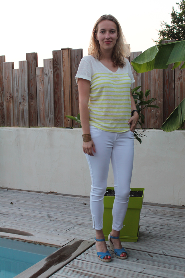 Après m’être creusé les méninges et avoir retourné ma valise, j’ai composé ce look. Je porte mon nouveau top marinière jaune, (ça change des codes classiques de la marinière, en plus elle est légèrement decolleté au dos) trouvé pendant les soldes chez IKKS, mon pantalon blanc 7/8ème Cache Cache déjà vu ici, et pour le côté « nautique » j’ai assorti le bleu de la piscine à mes nouvelles espadrilles compensées Eram. Qu’en pensez-vous ? Ai-je réussi ma mission ?