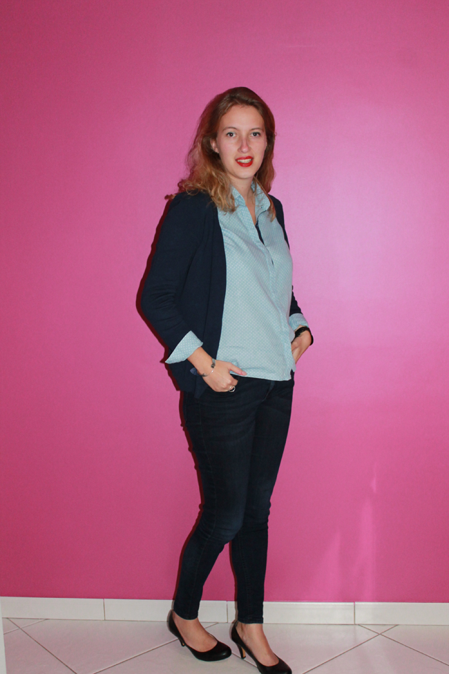 Chemisier Grace et Mila (dispo ici) / Gilet Tissaia / Skinny Mango / Escarpins Eram / Accessoires Le Petit Monde D’Ameli Melo / RAL Esthée Lauder /