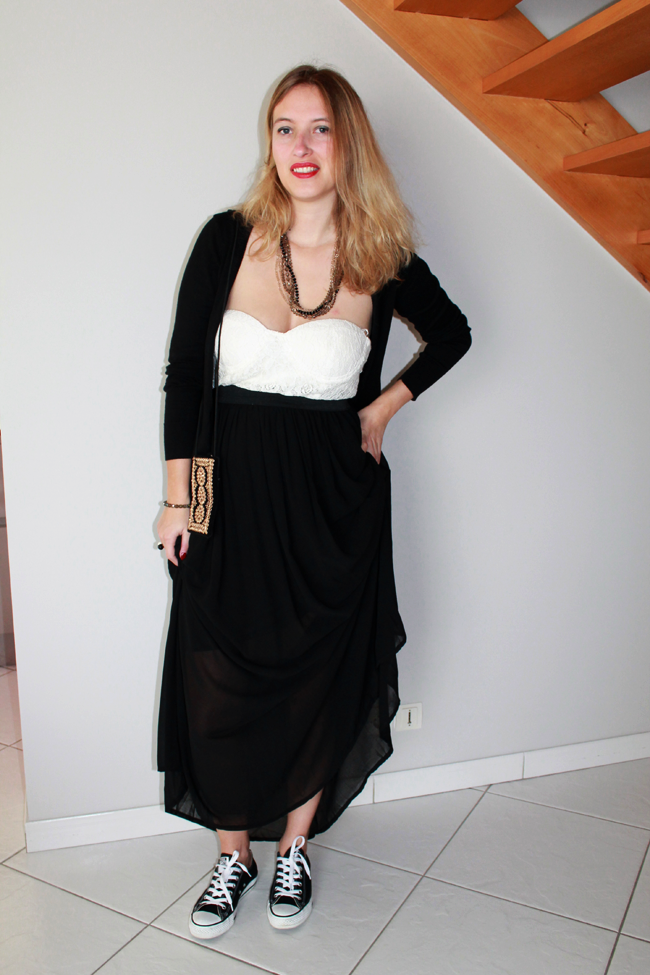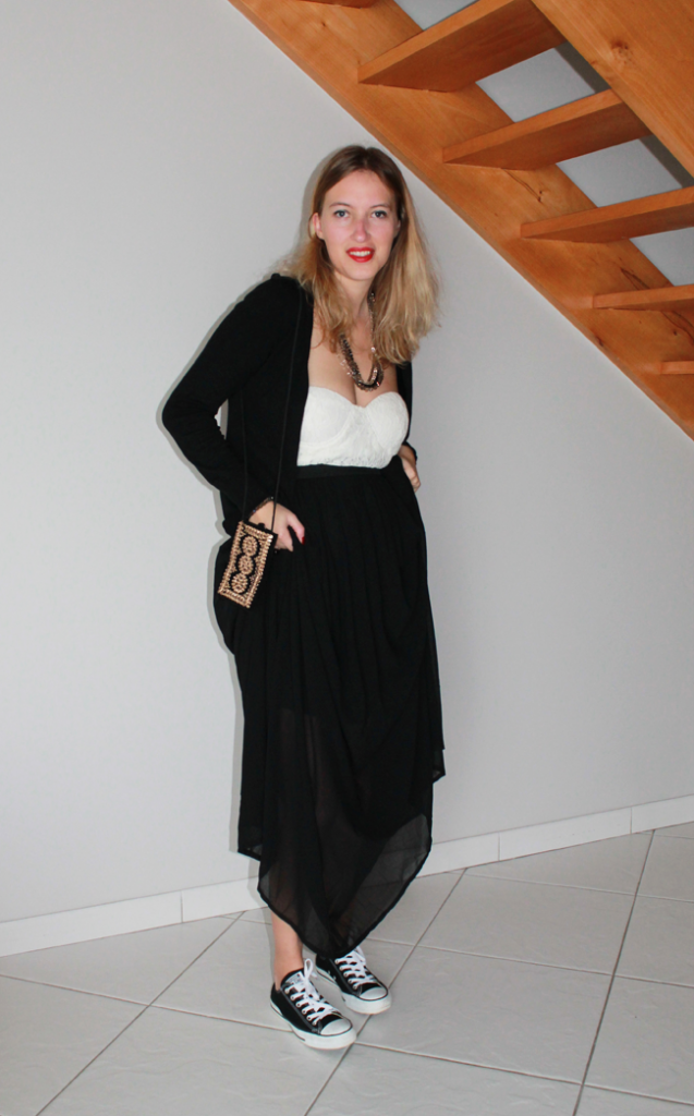 Toutefois, pour vous en dire plus, je porte une robe avec un bustier en dentelle Des Robes 2 filles déjà vu ici ou là, un gilet Tissaia, et les éternelles Converse basses noires. Côté accessoires, un collier multi-rangs Caroll, une bague Bala Boosté, un bracelet By Clo, et une pochette Rajanee que je vous ai présenté avant hier ici. Elles est brodée à la main et a fait un long voyage depuis l’Inde. J’aime quand les accessoires racontent une histoire et celui-ci me touche beaucoup.