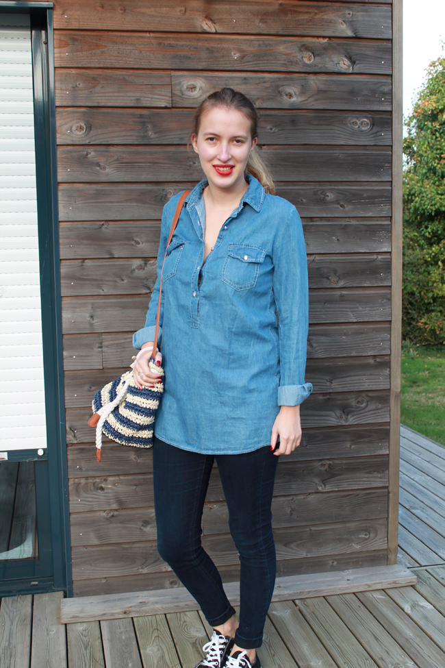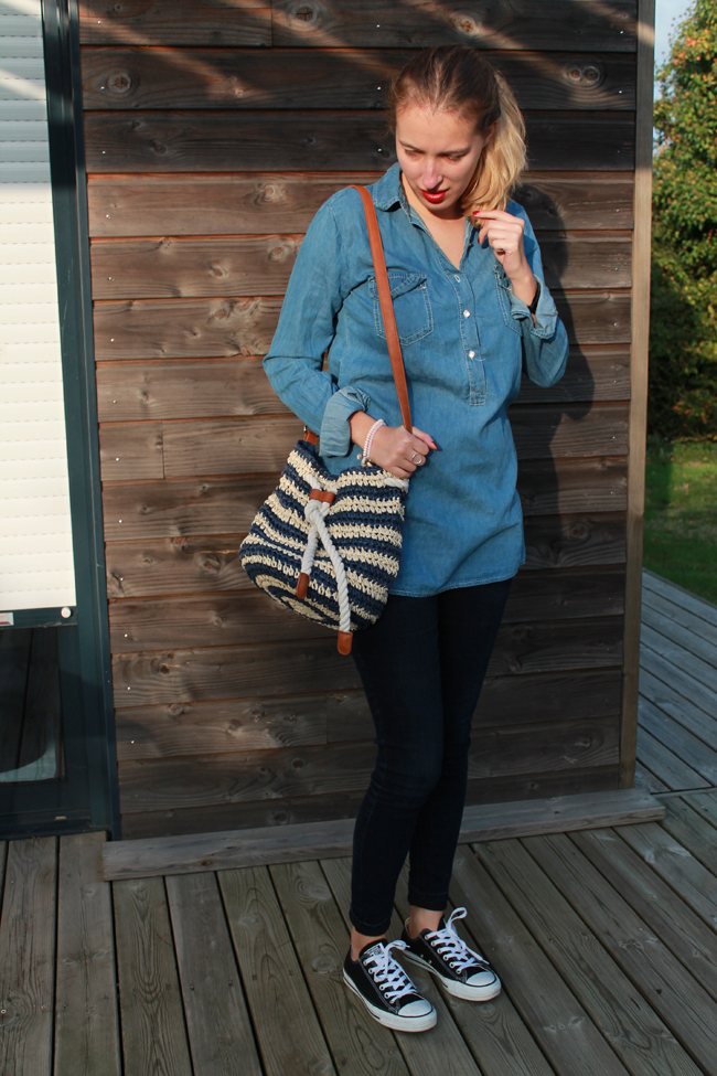 Pour ce nouveau look, je porte une tunique/chemise en jean sans marque, un skinny Mango et des sneakers Converse. Du côté des accessoires, je porte un sac Teddy Smith, une bague Clio Blue, et des bracelets UBDP. D’ailleurs UBDP vous propose une très jolie collection de pulls faits main à l’esprit bohème. Retrouvez-les ici.