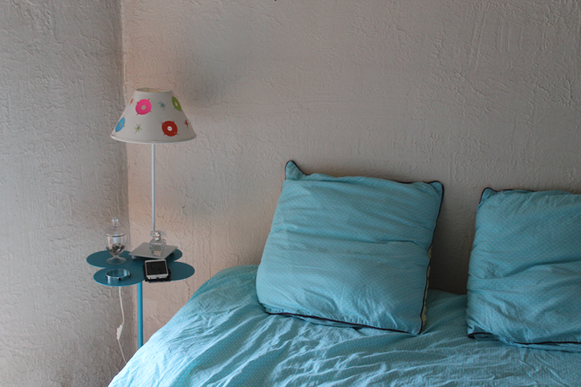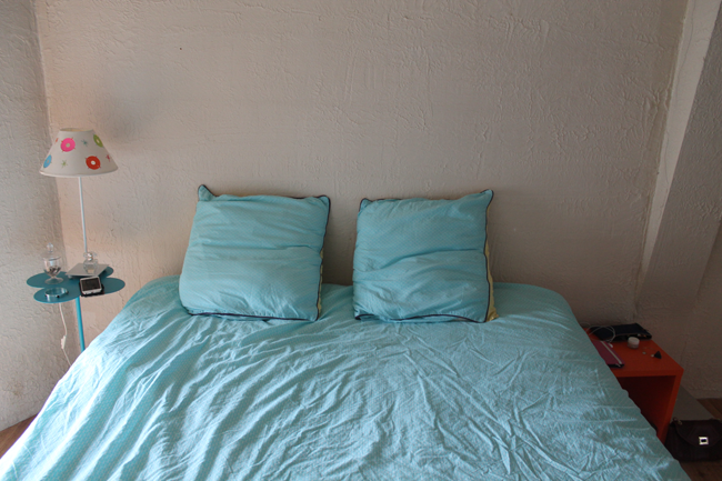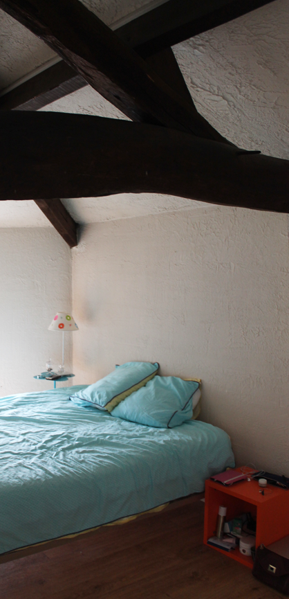S’approprier l’espace et les volumes, apprendre à utiliser l’existant, le détourner pour pouvoir en faire un ensemble harmonieux. C’est l’esprit dans lequel je suis actuellement. Tout n’est pas parfait, mais étant donné que je ne suis pas sûre de rester dans cet appartement, je n’ai pas envie de faire trop de frais non plus. C’est vrai que j’ai d’abord aménager avec l’essentiel, un frigo, un lit, une table et des chaises. Ensuite, j’ai trouvé un canapé et un peu de décoration. Récemment, j’ai mis la main sur trois tourets qui sont parfaits comme tables de salon. Il faut d’ailleurs que je me décide, peinture ou vernis ? La cuisine, le salon/séjour sont donc aménagés pour ce qui est de la chambre c’est plus compliqué.
