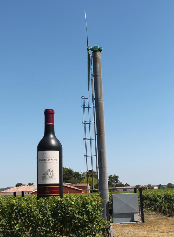 Suivant la météo du printemps, Marie-Anne m’explique que la bouteille n’est pas uniquement là pour faire la publicité du château, mais qu’il s’agit en fait d’une tour anti-gel. En mars, la bouteille est retirée et dessous, se cache une chaudière. Dans le sol, il y a des sondes qui mesurent la température ambiante ce qui permet d’enclencher l’hélice en cas de gel. L’hélice brassera alors l’air et évitera au gel de s’installer sur la vigne. A Saint Emilion, seulement 7 vignobles disposent de ce type de matériel. Plutôt utile, puisqu’une année en raison des mauvaises conditions météorologiques, Marie Anne a perdu plus de la moitié de sa production.