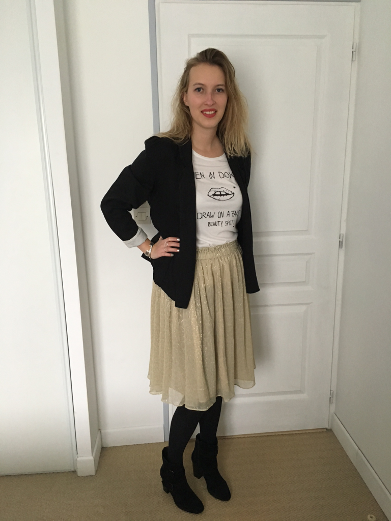 En plus d’avoir une jupe de « princesse », j’étais haut perchée. Pour finir l’année en beauté, j’assume la jupe gold et les talons hauts malgré mon mètre 77 !