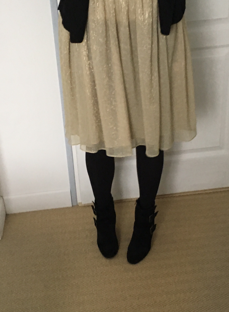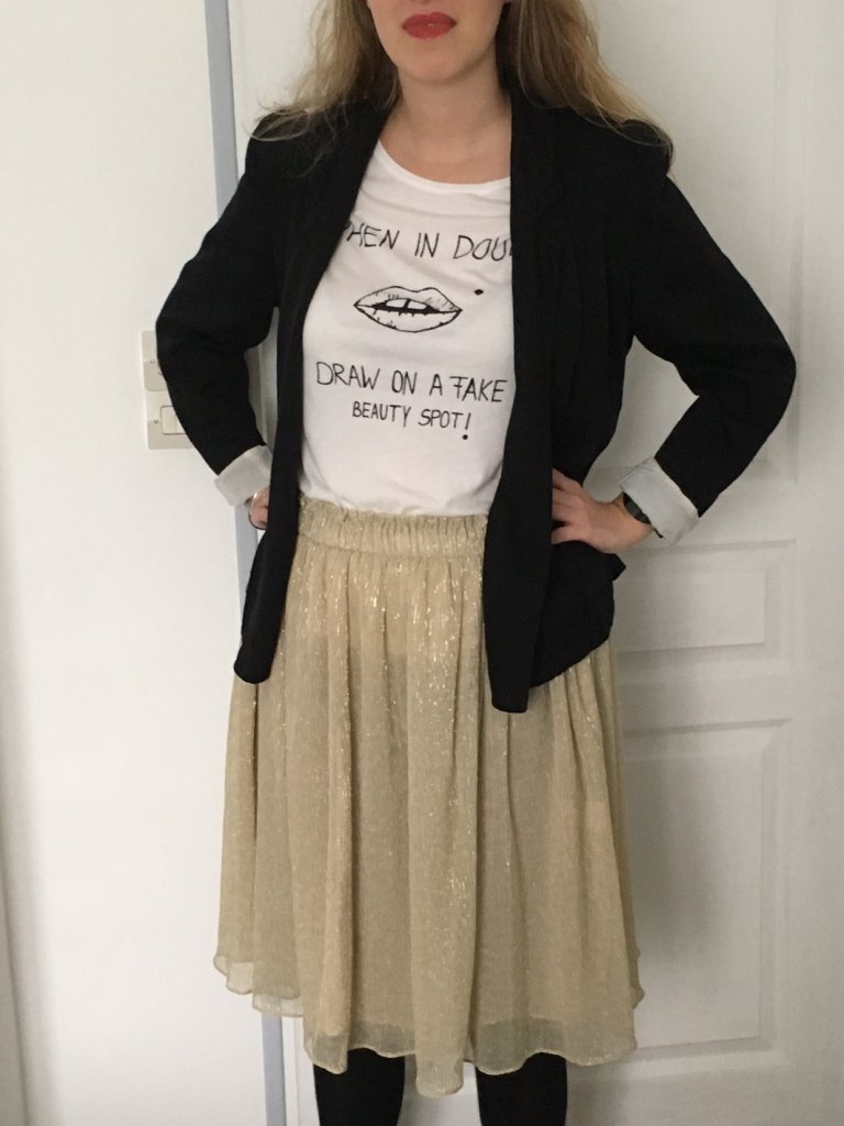 Et puis, la folie m’a emporté et vendredi après-midi, j’ai craqué à la boutique Galeries Lafayette Outlet de Marques Avenue à la Séguinière, pour cette jupe mi-longue avec plis et des reflets dorés. Je remercie l’équipe des Galeries et j’espère que ce petit look leur plaira. Pour une fois, que les vendeurs sont agréables, autant le souligner !