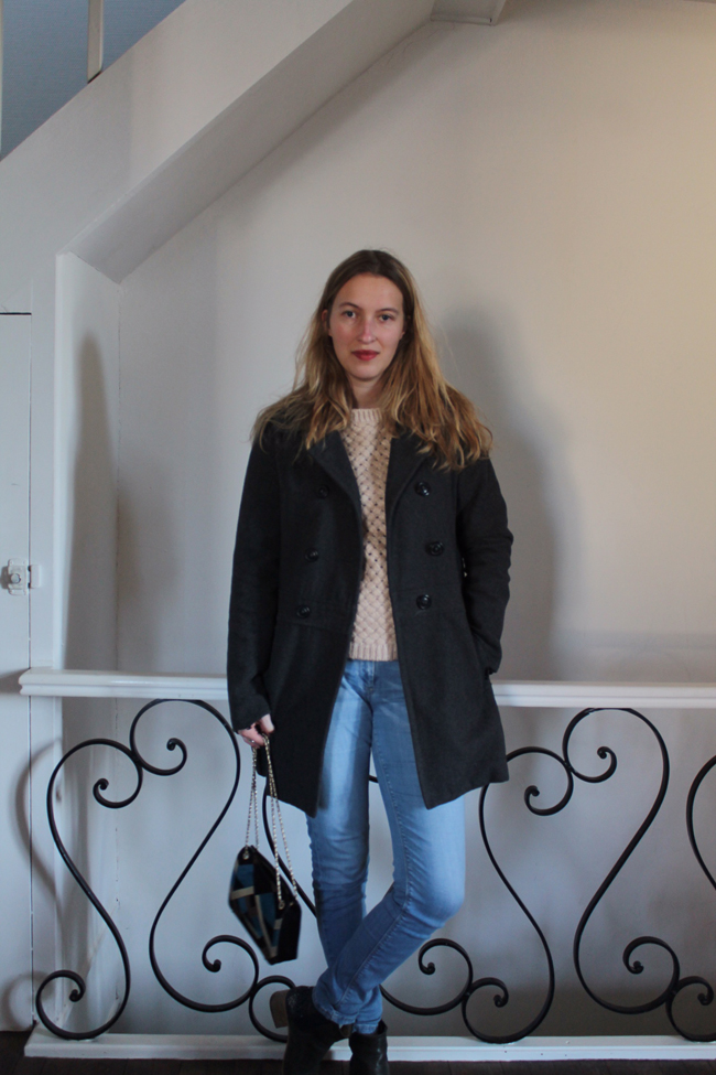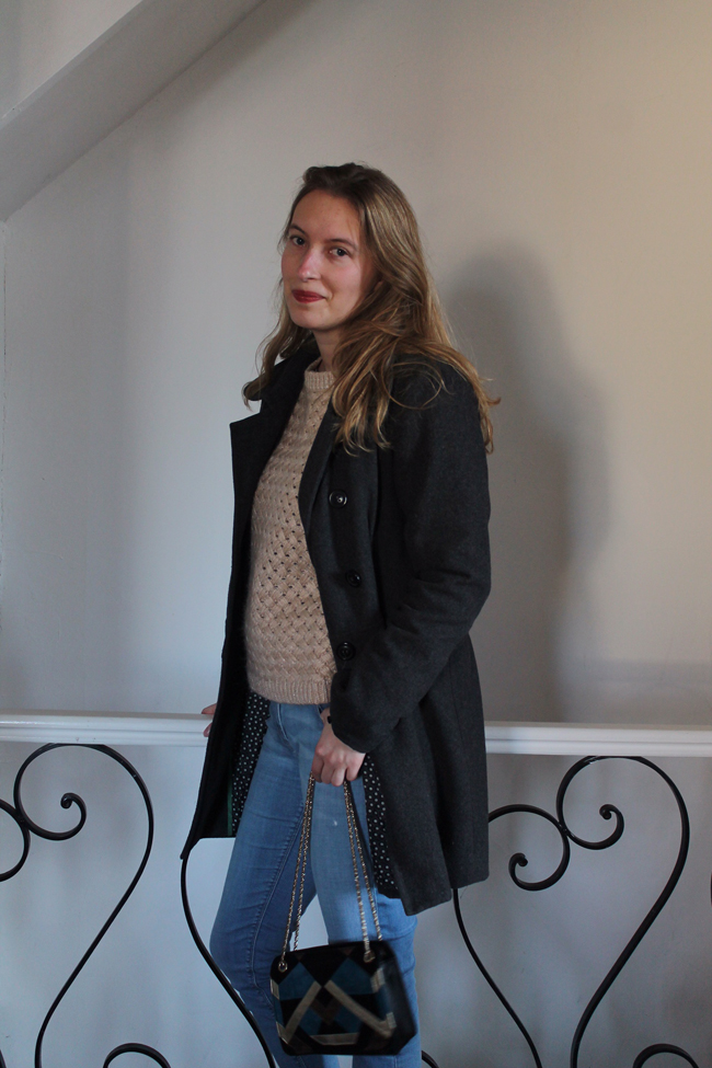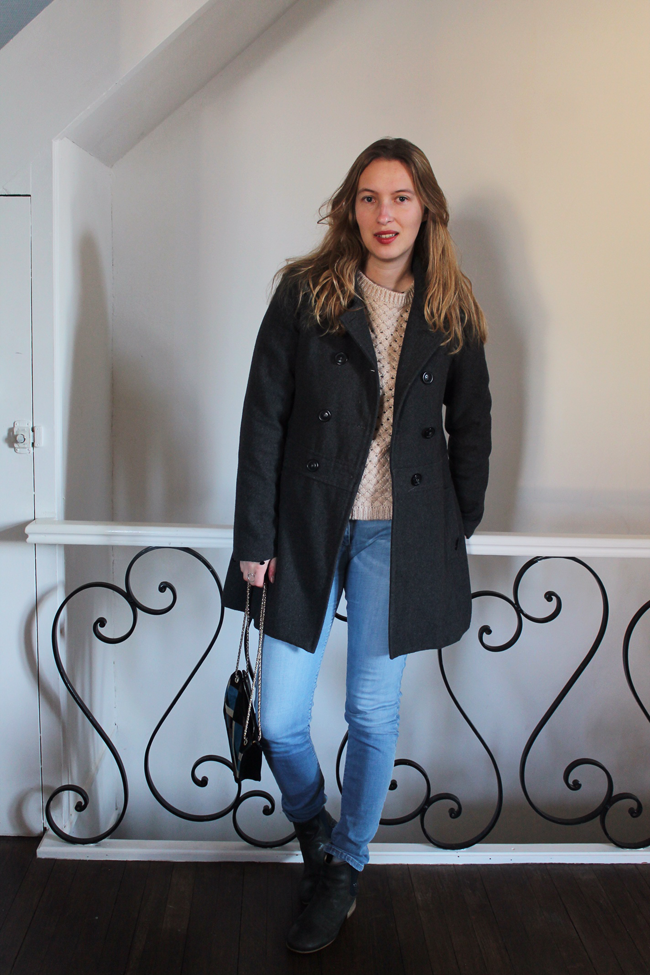 Je porte donc une marinière à manches longues sous mon nouveau pull doudou. Je l’ai trouvé à l’Appart Chic lors des ventes privées. Il est de la marque Andy & Lucy, une marque abordable qui ressemble un peu à Grace et Mila. Ce que j’aime, c’est son côté tout doux, sa couleur rose poudré et les quelques fils argenté qui viennent agrémenter son côté si sage. Je ne sais pas si vous avez ce problème également, mais je trouve qu’il est difficile de trouver un joli pull et qui plus est, ne nous rende pas l’image d’un sac à patates. En réalité, j’ai très peu de pulls dans mon dressing parce que je trouve que ça ne me va pas, ça me grossit (et je n’ai pas besoin de ça ;)) ! J’ai des pulls fins noires basiques et des gilets de toutes les sortes, mais quasiment pas de pull. Voilà pourquoi je n’ai pas trop hésité quand j’ai trouvé celui-ci malgré son prix élevé. Désormais, je sais que je peux oser les pulls de cette couleur mais aussi les pulls avec de grosses mailles.