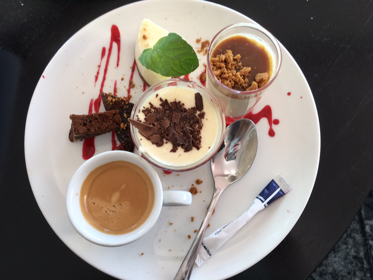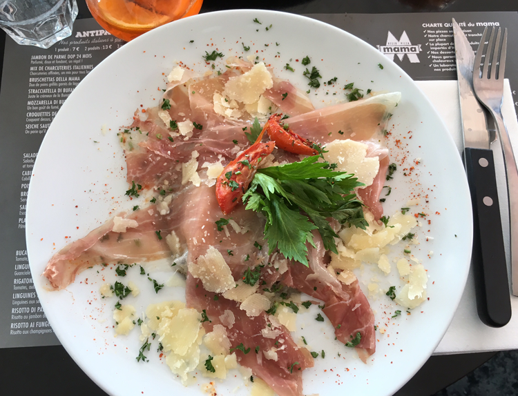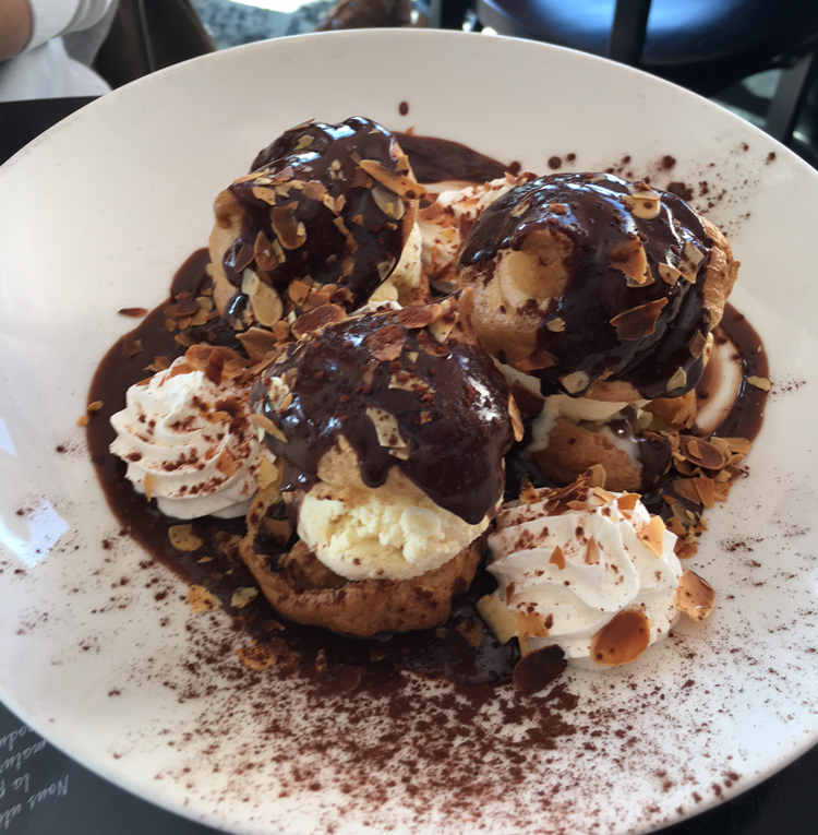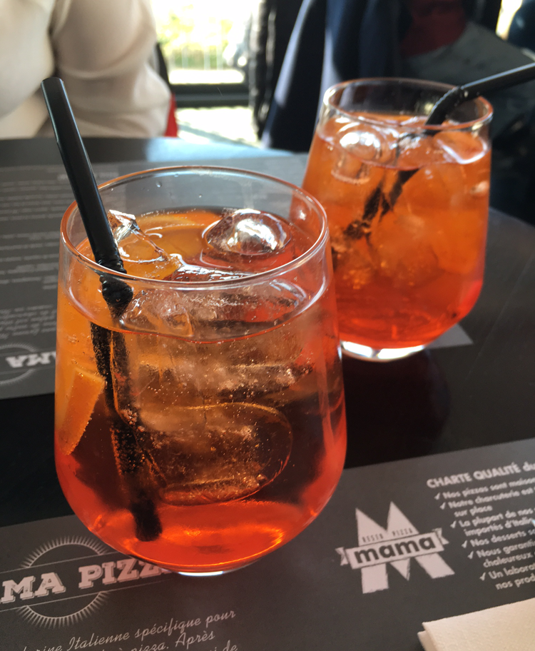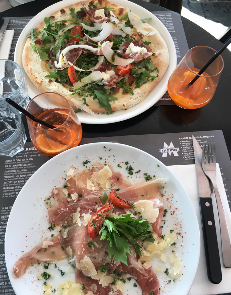 Pour le menu, tout me fait envie, c’est difficile de faire un choix. Du coup, on commence par commander un Spritz avec une bruschetta, pour l’apéro. Attention, l’assiette d’antipasti est copieuse. Mais on continue sur notre lancée avec la pizza Mama, spécialité de la maison et le risotto à la truffe. C’est tellement bon que l’on se laisse tenter par un dessert. Je prends le café gourmand pour goûter à un peu de tout et elle se laisse tenter par les profiteroles.
