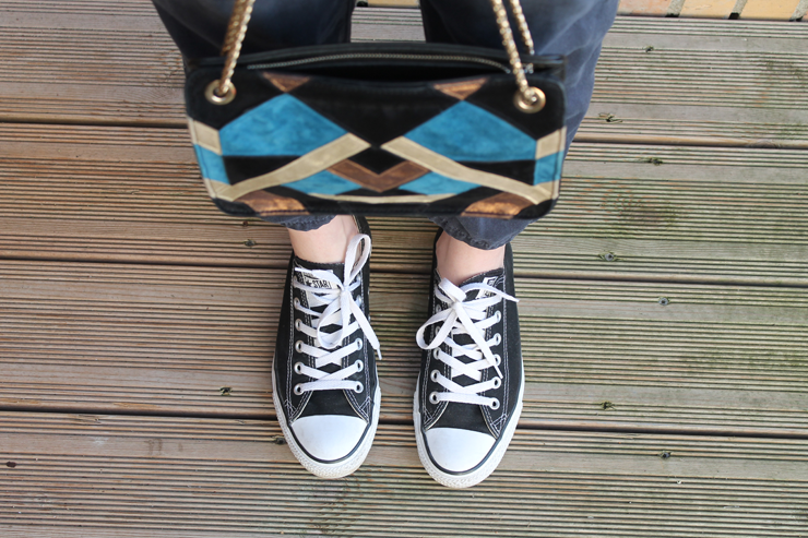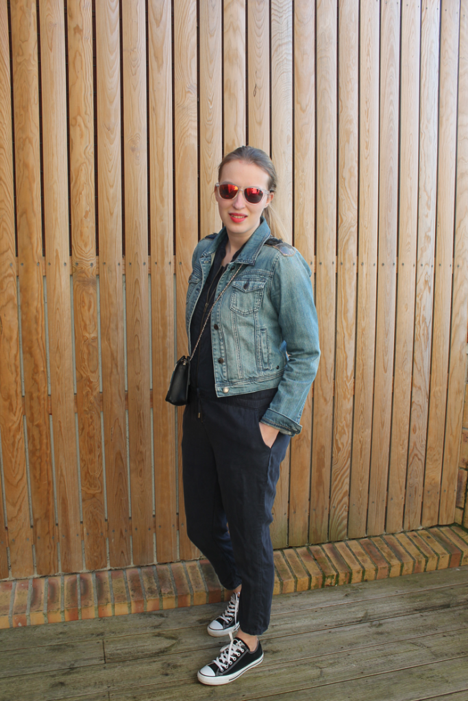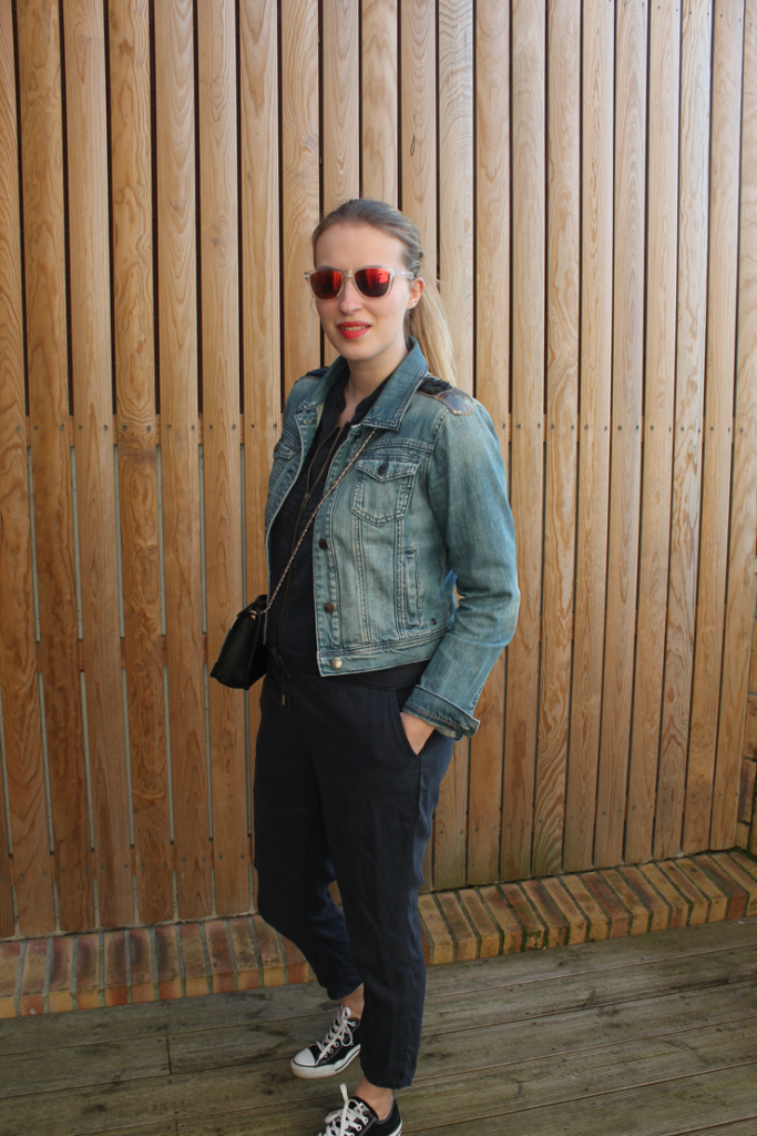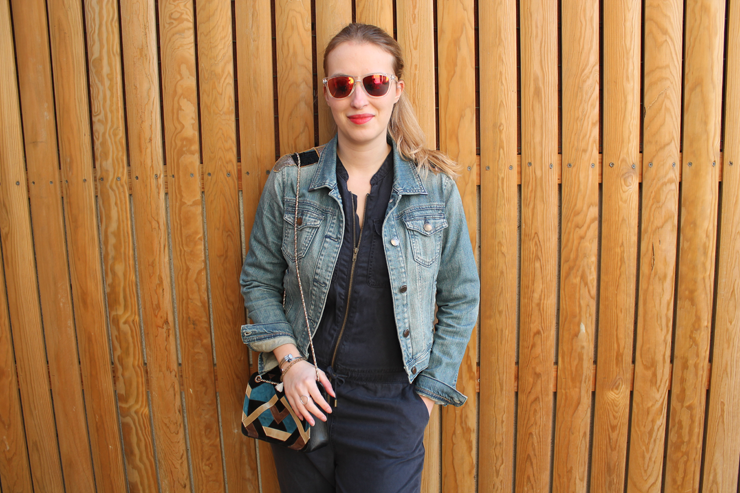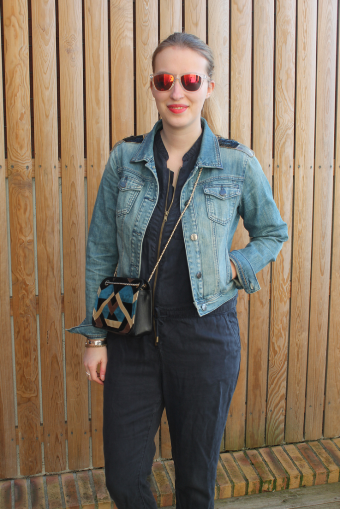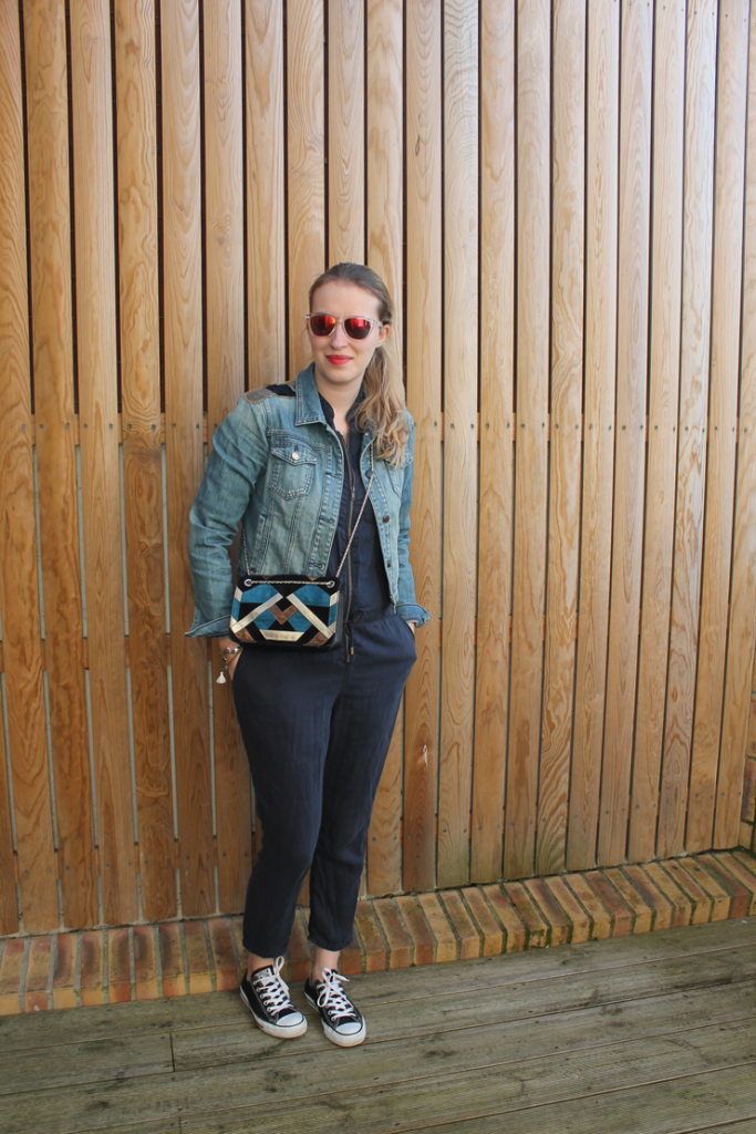 Combinaison Lab Dip chez Dé-K-Lé similaire ici / Veste en jean Bonobo Jeans (old) / Sac Sezane / Baskets Converse / Lunettes de soleil Binocle Eyewear (100% personnalisable)