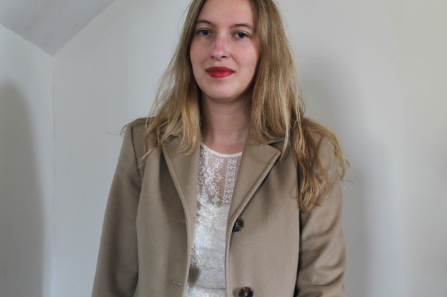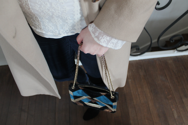 Jean Skinny MANGO / Blouse IKKS / Manteau BENETTON / Boots Mazélie & CO / Sac SEZANE / Bijoux by CLO / Rouge à lèvres CHANEL