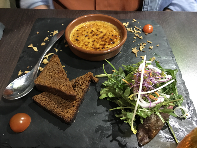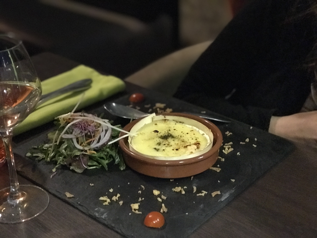 La carte est plutôt sympa et il y en pour tous les goûts, du poisson, des fruits de mer et un peu de viande. Les filles ont opté pour une entrée, camembert rôti pour l’une et crème brûlée au foie gras, pour l’autre.