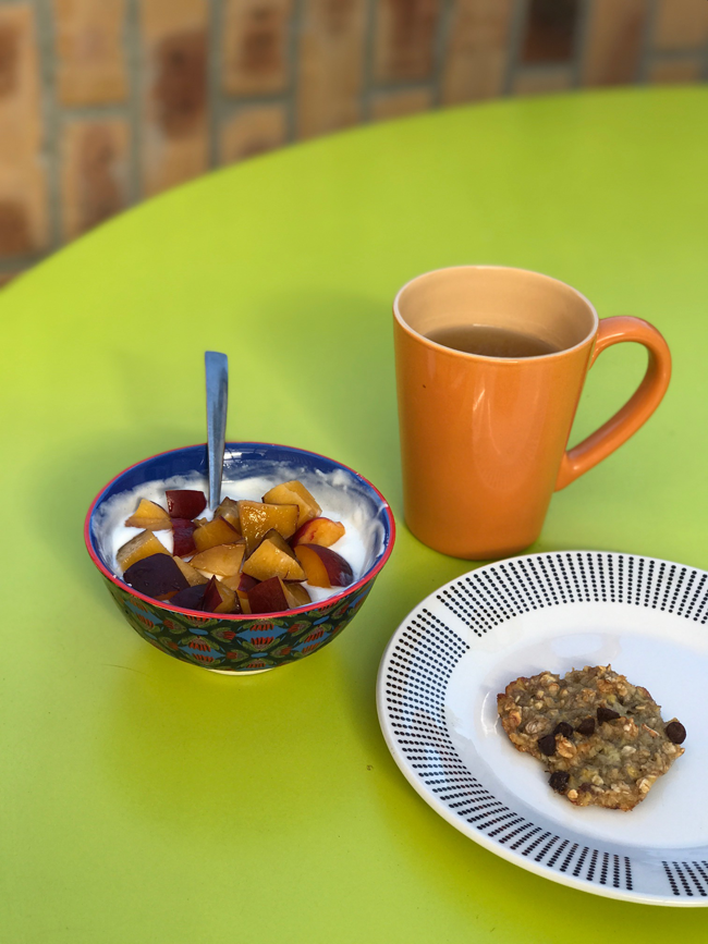 Au petit-déjeuner, mes habitudes n’ont pas changé puisque je prenais déjà un thé et un fromage blanc avec des fruits ou du muesli bio. Il m’arrive de me faire des pancakes céto à base de poudre d’amande, et d’oeufs. La poudre d’amande remplace la farine. Je les fais généralement cuire dans une poêle huilée avec de l’huile de coco bio.